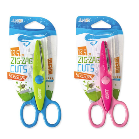 Olló Zig-zag Junior, 13,5 cm Gyerek olló bliszter csomagolásban, mindennapi használatra. A pengék rozsdamentes acélból készültek, műanyag borítással a kényelmes használat érdekében. A lekerekített hegy biztonságossá teszi az ollót a gyermekek számára.