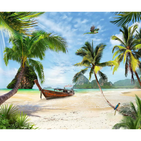 1 kép Öntapadó és mosható falfestmény Strand, csónak, papagáj, 250 x 200 cm