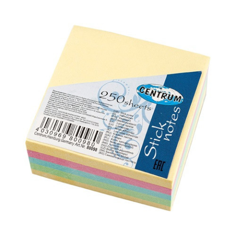 Öntapadós jegyzettömb Centrum Stick Notes 51x51 mm 250 lapos pasztell vegyes színek Öntapadós pasztel színű jegyzettömbideális üzenetek,jegyzetek készítésretöbbször visszaszedhető, újra ragaszthatóméret: 51x51mmvastagság: 250 lap