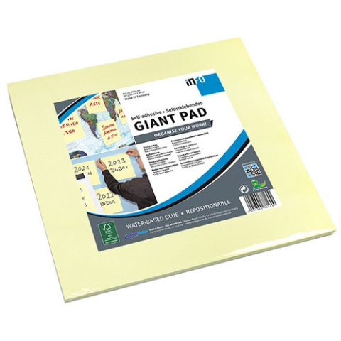 Öntapadós jegyzettömb Info Notes Giant Pad 300x300 mm 50 lapos sárga Extra nagyméretű öntapadós jegyzettömbMéret: 300 mm x 300 mmKivitel: 50 lap/tömbSzín: sárgaIdeális prezentációkhoz, csoportos megbeszélésekhez