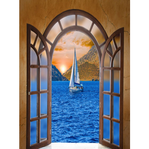 1 kép Öntapadós tapéta Fa kapu, tenger, csónak, 150 x 205 cm
