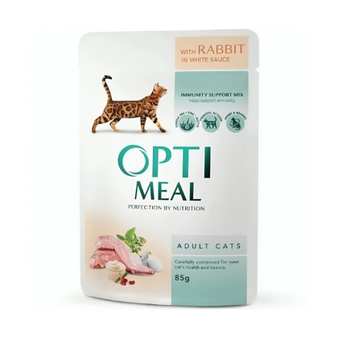 Teljes OPTIMEAL Szuper Prémium nedves macskaeledel - Nyúl , fehér szószban(85g) termékleírás