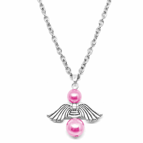 Őrangyal medál pink mesterséges gyöngyökkel gyerek nyaklánc medállal, ezüst színű nyaklánc termékleírás