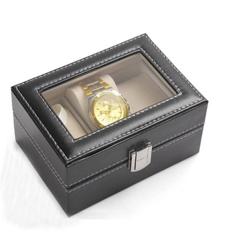 Műbőr óratartó doboz, óradoboz 3 óra tárolására fekete színben, fehér varrással! Belseje világos színű szövet. Külső méretei: Szélesség: 15,5cm Magasság: 8,5cm Mélység: 11,5cm Belső fakkok mérete (/fakk): Szélesség: 45mm Mélység: 95mm