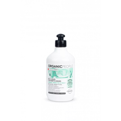 Organic People Öko Mosogatószer babaedényekhez bio zöld teával és barackkal 500 ml A japán L-Aminosav tenzidet, és egy bőrpuhító növényi összetevőt tartalmazó gyengéd mosogatószer ideális babaedények, játékok, gyümölcsök és zöldségek tisztítására. Oldja