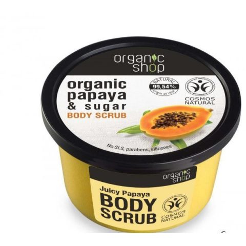 Gyümölcsös testradír bio papaya kivonattal és természetes cukorral, mely kíméletesen radírozza és tisztítja bőrét, miközben fiatalító hatással és elragadó illattal bír. Használat: Vigye fel körkörös mozdulatokkal nedves bőrére, majd alaposan öblítse le.