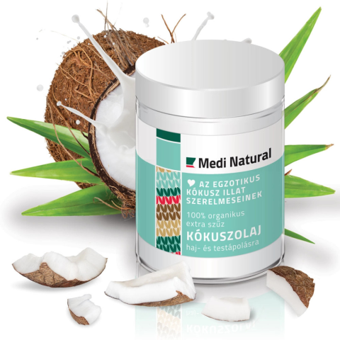 100% organikus extra szűz kókuszolaj, BŐRÁPOLÓ OLAJ, COCOS NUCIFERA OIL 100% A kókuszolaj az egzotikus kókusz illat szerelmeseinek lehengerlő haj és testápoló olaj. Az érett trópusi kókuszdió húsából, hagyományos hidegen sajtolással nyert MediNatural