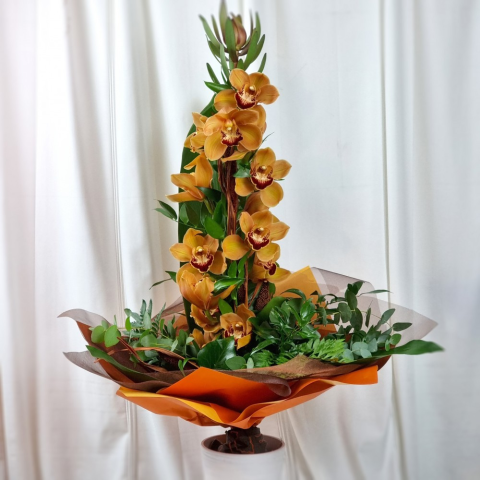 Aranyló orchidea elegancia Összetétel: Aranyszínű cymbidium orchidea Nagy, díszítő levelek Zöld eukaliptusz és páfrány Barna, száraz termések Barna és narancs díszcsomagolás hálós díszítéssel Ez a modern, függőlegesen elrendezett kompozíció a kifino