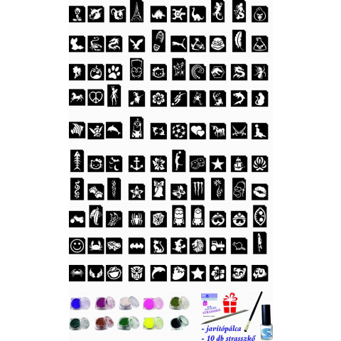 Óriás csillámtetoválás készlet (112 db-os - 100 sablon / 10 csillámpor)