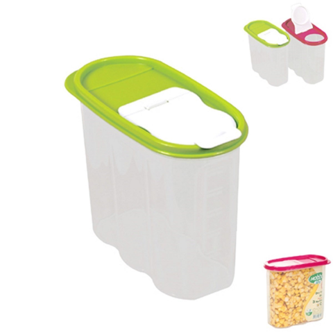 Műanyag zárható tároló adagoló nyílással alkalmas élelmiszerek tárolására. Tárolhat benne pl. lisztet, cukrot, gabonaféléketm, tésztát és sok mást is. Különböző színekben (bézs, fekete, rózsaszín, zöld és szürke) kínáljuk választás lehetősége nélkül. Méretei: 19 x 9,5 x 17 cm