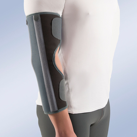 Termék jellemzői: - A könyököt kinyújtottan rögzítő ortézis. - Belül frottírból, kívül méhsejtszövetből és velúrból készült; merev alumínium sínekkel a hátoldalon és az oldalakon; rögzítés tépőzáras pántokkal. - Elöl nyílással van kialakítva, amely lehető