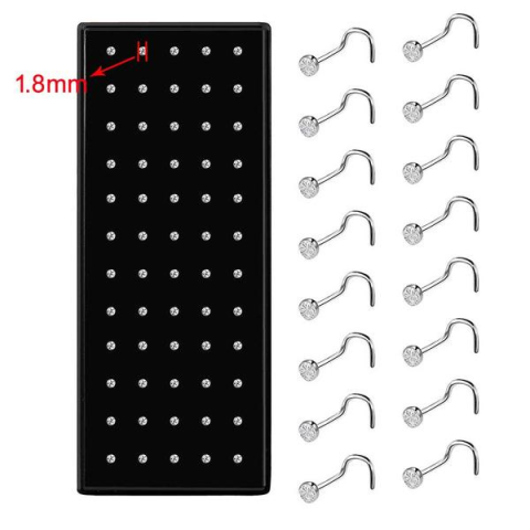 60 darabos csavart orr piercing szett fehér strasszkövekkel, 316L orvosi acélból. Antiallergén, tartós és stílusos testékszer mindennapi és alkalmi viseletre