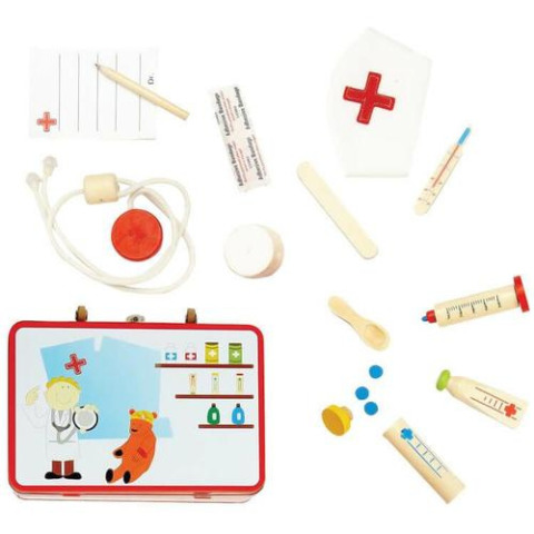 Orvosi játék készlet fém bőröndben, a legszükségesebb egészségügyi kellékekkel (sztetoszkóp, receptek, fecskendő, lázmérő, gyógyszerek). Termékméret:20x7x13cm