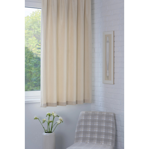 Oscar/02, ekrü színű, minta nélküli dekor készfüggöny, ráncolószalaggal. Mérete 140 cm x 175 cm. Alapanyaga 100 % poliészter.