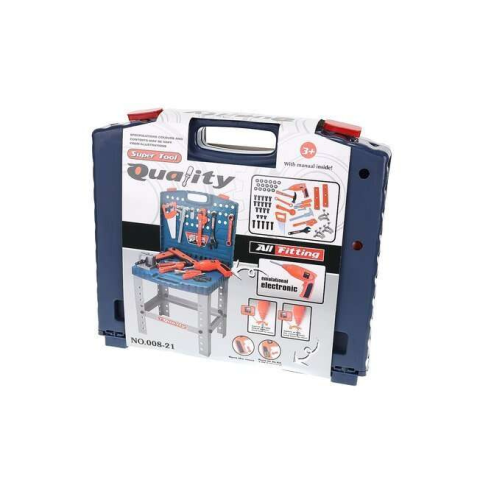 2 az 1-ben – az egész készlet praktikus, könnyen hordozható tokban elfér. Nem probléma, minden elemhez illeszkedik, és lehetővé teszi a gyermek számára, hogy elvigye óvodába, nagyszülőkhöz vagy barátokhoz. A bőrönd kibontása után egy nagy munkalappal rendelkező műhely lesz, csak a bőrönd egyik részét kell 180 fokkal elfordítani! Ezután a készletben található lábakkal és csavarokkal csavarja be őket egy műhely létrehozásához. Egy nagyobb gyerek minden b