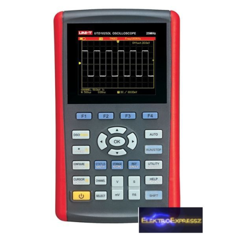 Oszcilloszkóp UNI-T 25MHz UTD1025DL /kézi/ MINI Kis kézi oszcilloszkóp színes kijelzővel és multiméter, 2 csatorna, 25MHz, 200 ms / s Műszaki adatok: csatornák 2 Sávszélesség 25MHz Mintavételi sebesség 200 ms / s Mintavételi frekvencia