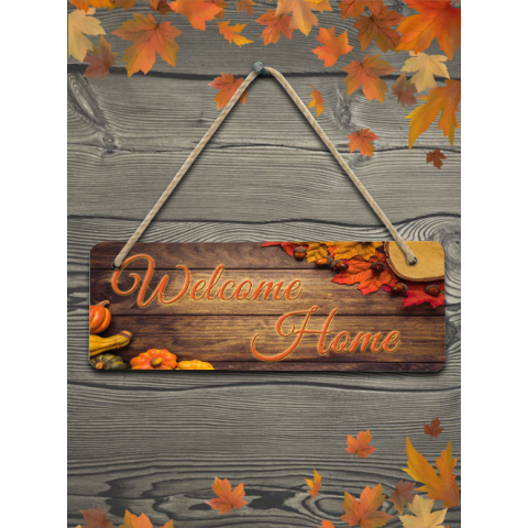 Őszi ajtódísz, Welcome Home. Hangulatos, őszi színekben pompázó üdvözlő tábla ajtóra. Varázsolj Te is őszi hangulatot otthonod ajtajára és üdvözölj másokat egy szuper kopogtatóval. Fényes felületű, gyönyörű nyomat, anyaga MDF fa, mérete: 28x10 cm, vastags