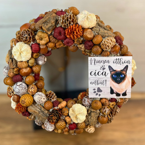 Kedves ajándék és különleges dekoráció minden macskabarát számára! Ez az őszi DIY koszorú természetes anyagokkal és cicás táblácskával készülhet el, amely otthonos és szerethető hangulatot teremt