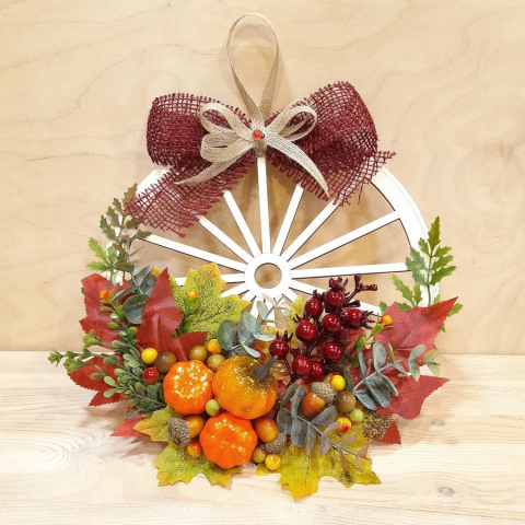 Ez az őszi koszorú natúr fa keréken az ősz meleg színeit hozza otthonodba, irodádba, megtörve a borongós napok szürkeségét. Kézműves termék, ez az egy készült belőle, és nem is lesz ugyanilyen másik.
