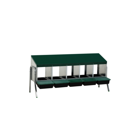 Praktikus, 5 állásos tojófészek műanyag aljjal és lábakkal kis és közepes méretű tyúkfarmok számára. Horganyzott fém konstrukció, könnyű tisztítás. Kényelmes tojásgyűjtés a kihúzható műanyag aljnak köszönhetően. Magasított kialakítás a könnyű hozzáférésér