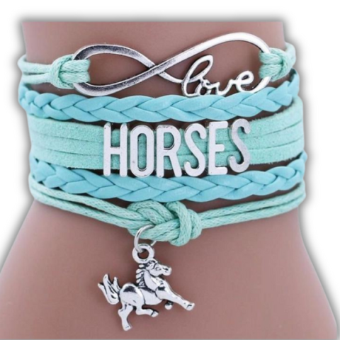 Stílusos, ötsoros bőr karkötő „Szeretem a lovakat” medálokkal. Egyedi lovas ajándékok között a legjobb választás, amit a szenvedélyed kifejezésére viselhetsz