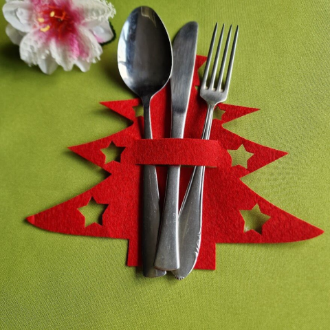 Karácsonyi Fenyőfa Filc Evőeszköztartó - Piros 🎄🍽️ Dobd fel az ünnepi asztalt ezzel a bájos, piros fenyőfa alakú filc evőeszköztartóval! Tökéletes kiegészítője a karácsonyi vacsorának, céges buliknak vagy akár otthoni dekorációnak. Miért válaszd ezt...