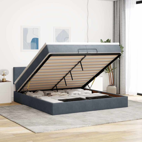 Ágykeret fejtámlával:Színe: sötétszürkeAnyaga: bársony (100% poliészter), fém, furnérlemez, szerelt faTeljes mérete: 203 x 200 x 78/88 cm (Ho x Szé x Ma)Max. teherbírás: 140 kgÁgy alatti tárolóHidraulikus emelőszerkezetÖsszeszerelést igényel: igenMatr