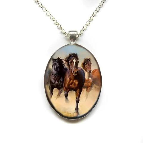 Fedezd fel az elegáns ovális lovas nyakláncot, amely vágtató lovak képével díszítve tökéletes választás a lovaglás és az állatok szerelmeseinek