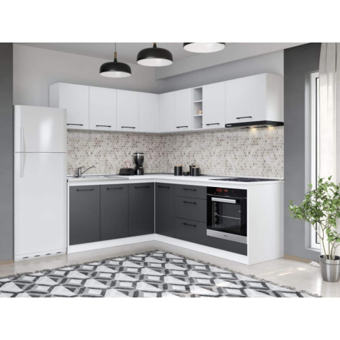 Modern antracitszürke-fehér sarokkonyhabútor – 184 × 220 cm, moduláris rendszerrel és 28 mm-es munkalappal Ez a modern, moduláris konyhabútor szett praktikus elrendezésével és stílusos antracitszürke–fehér színkombinációjával kiváló választás lehet bármel