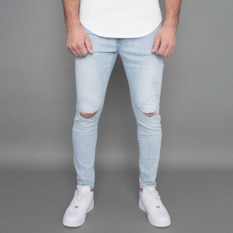 Super Skinny világoskék farmernadrág, szaggatott, zsebekkel és cipzáros sliccel FONTOS: Egy mérettel nagyobbat válassz a megszokott méretednél Modell: 185 cm/ 85 kg/ 36-os méret