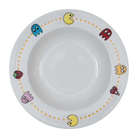 Pacman-es mélytányérKézzel festett porcelán tányér. mely felirattal névre szólóvá is tehető.A porcelánt festés után 820 fokon égetem ki, mikrohullámú sütőbe betehetők, mosogatógépben tisztíthatók.