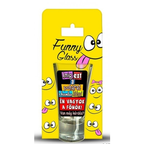 Pálinkás pohár, Amíg ezt a poharat a kezemben látod, én vagyok a főnök. Van még kérdés? Anyaga: üveg Űrtartalom: 5 cl Befoglaló mérete: 7 x 5 x 15 cm
