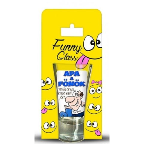 Pálinkás pohár, Apa a főnök, amíg anya haza nem jön. Anyaga: üveg Űrtartalom: 5 cl Befoglaló mérete: 7 x 5 x 15 cm