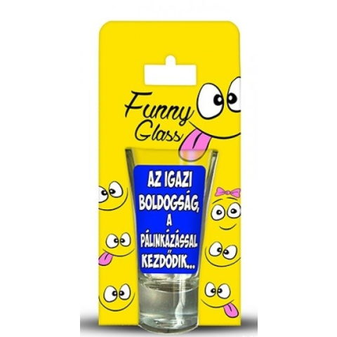 Pálinkás pohár, Az igaz boldogság a pálinkázással kezdődik Anyaga: üveg Űrtartalom: 5 cl Befoglaló mérete: 7 x 5 x 15 cm