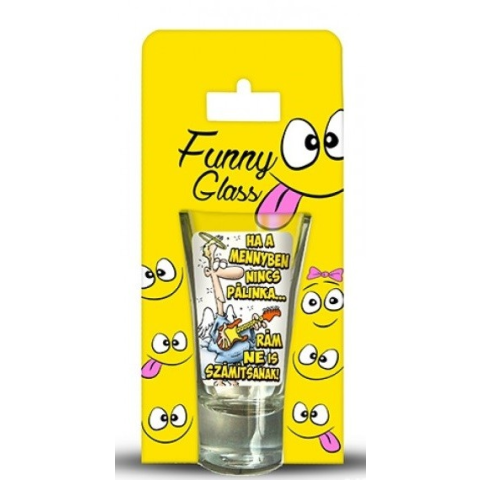 Pálinkás pohár, Ha a mennyben nincs pálinka, rám ne is számítsatok Anyaga: üveg Űrtartalom: 5 cl Befoglaló mérete: 7 x 5 x 15 cm