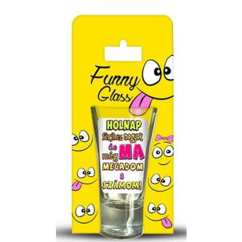 Pálinkás pohár, Holnap férjhez megyek, de ma még megadom a számom Anyaga: üveg Űrtartalom: 5 cl Befoglaló mérete: 7 x 5 x 15 cm