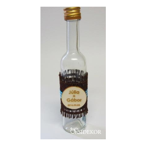 Pálinkás üveg (üresen) egyedi fa díszítéssel Ezt az üvegcsét üresen kapod, hogy azzal tölthesd meg vendégeid számára, amivel csak szeretnéd. Elsősorban pálinkát vagy magvakat ajánlunk hozzá, de a fantáziádra van bízva, hogy miből lesz köszönetajándék.