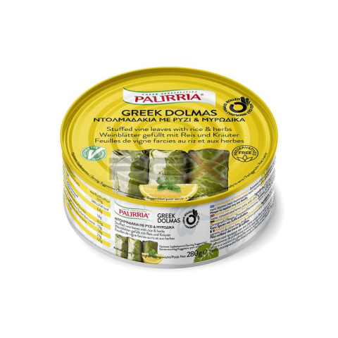 Rizzsel töltött szőlőlevél. Sterilizált termék.Összetevők: 60% főtt rizs, 10% szőlőlevél, Szójaolaj, Hagyma, Citromlé a citromlé koncentrátumból, 2,7% kapor, 1,4% menta, Só, Fekete bors, Savanyúságot szabályozó anyag: citromsavAllergének: Nyomokban t
