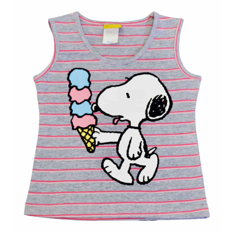 Kényelmes, ujjatlan kislány trikót kínálunk a forró nyári napokra, amely vidám, színes Snoopy mintával díszített. A szürke csíkos trikó vékony, minőségi, 100% pamut anyagból készült, ami jól bírja a mosást, szín- és formatartó.