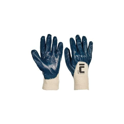Anyag: Mártás: nitril Alapanyag: pamut, Kötött Mandzsetta: pamut, Kötött Leírás: Kötött pamutkelméből varrt, nitrilbe félig mártott kék kesztyű rugalmas kötött mandzsettával. Szabványok: EN 420 EN 388 (4111X) Jellemzők: Mandzsetta típusa: knitwrist Má