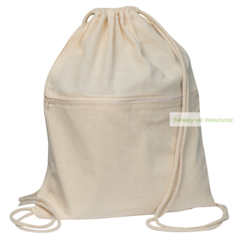 Oeko-Tex® STANDARD 100 minősítésű pamut tornazsák, 140g/m² anyagvastagságú környezetbarát, természetes színű pamutból, 2 zsinórral záródik, elöl cipzáras zsebbel. Méret: 37 × 0,3 × 46,5 cm Rendelésre: 3-10 nap! A dekoráció nem képezi az ajánlat részét!