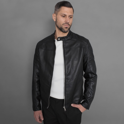 Slim Fit, fekete műbőr dzseki steppelt részletekkel, cipzáros kézelővel és oldalzsebekkel, patentos állógallérral és egy belső zsebbel. Modell: 185 cm/ 85 kg/ L-es méret