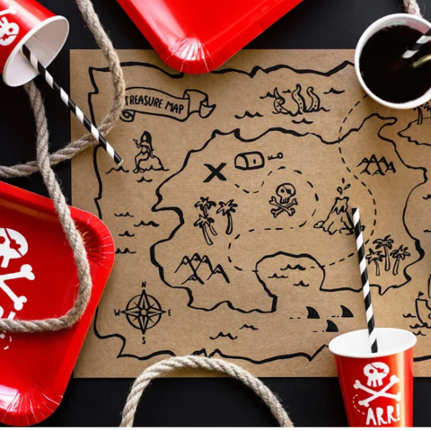 Papír alátét Pirates Party nátronpapírból fekete nyomattal, méret: szélesség kb. 40 cm, magassága kb. 30 cm. 1 csomagban 5 db van