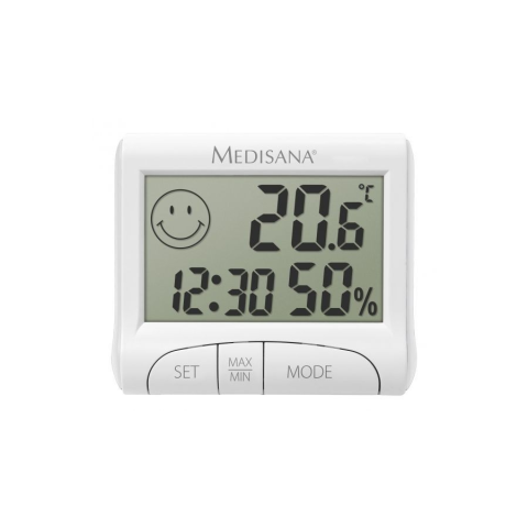 Beltéri hőmérséklet és páratartalom kijelzése, az egészségesebb levegőminőségért. Tulajdonságok: Legmagasabb és legalacsonyabb érték mentése Komfortzóna kijelzése (smiley): optimális egészséges, vagy egészségtelen beltéri klíma Időkijelzés Ébreszt