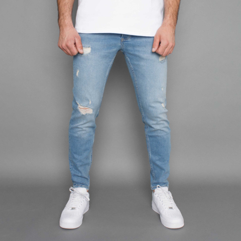 Skinny Fit, kék szaggatott és koptatott farmernadrág, zsebekkel és gombos sliccel Modell: 185 cm/ 85 kg/ 32-es méret