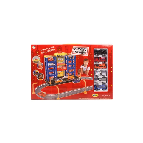 Parking Tower négyemeletes parkolóház autókkal autópálya és játékautó árgrafikon