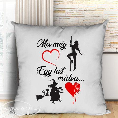 Párna lánybúcsúra, ajándék menyasszonynak lánybúcsúra. Ma még bulizik, egy hét múlva már boszorkány. Ajándék minden nőnek aki stílusosan búcsúztatja a szingli éveket. A párna mérete 40x40 cm, a huzat praktikus húzózárral ellátott, így könnyen levehető