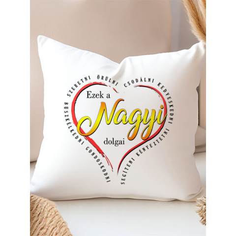 Párna nagymamáknak, egy Nagyi dolga. Ez a gyönyörű és megható párna tökéletes ajándék minden nagymamának, aki szeretettel gondoskodik családjáról. A szív alakban elhelyezett szavak, amik leírják mi is a dolga egy igazi nagymamának – szeretni, gondoskodn