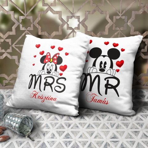 Páros ajándékok, Mr. és Mrs. Páros párna, évfordulós ajándék. Páros párna Mr & Mrs felirattal, szívecskékkel, saját nevetekkel, Mickey és Minnie figurákkal. Lepd meg magatokat Valentin napra, vagy évfordulós ajándéknak is tökéletes személyre szóló választ