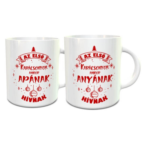 Páros bögre karácsonyra első anyukáknak és apukáknak, Az első karácsonyom, amikor Anyának hívnak, valamint Az első karácsonyom, amikor Apának hívnak felirattal. Karácsonyi ajándékba tökéletes választás. Egyedi nyomtatású bögréink kiváló választások s